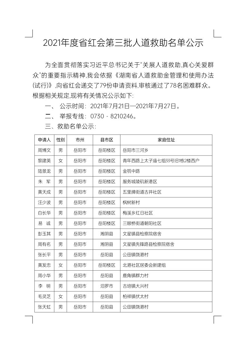 岳阳市红十字会2021年度省红会第三批人道救助名单、岳阳市红十字会2021年人道救助名单公示