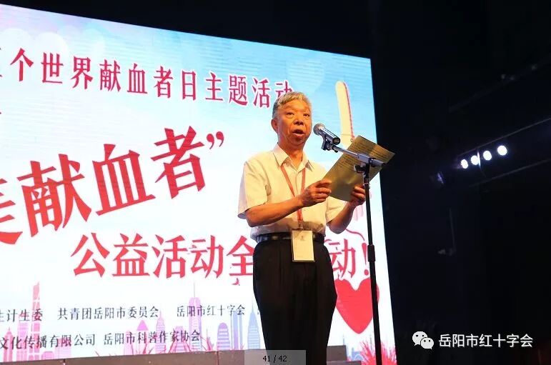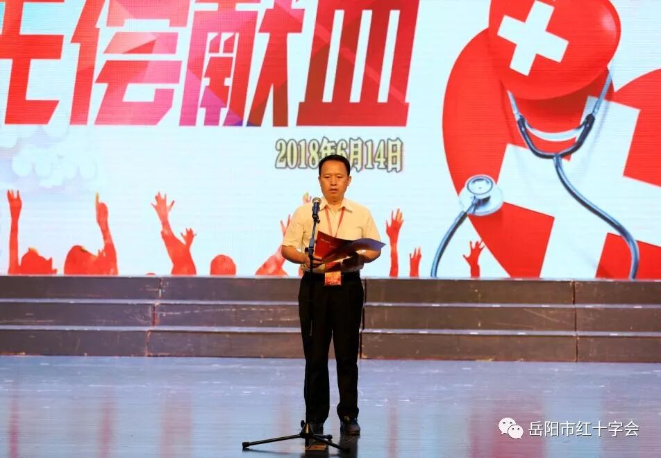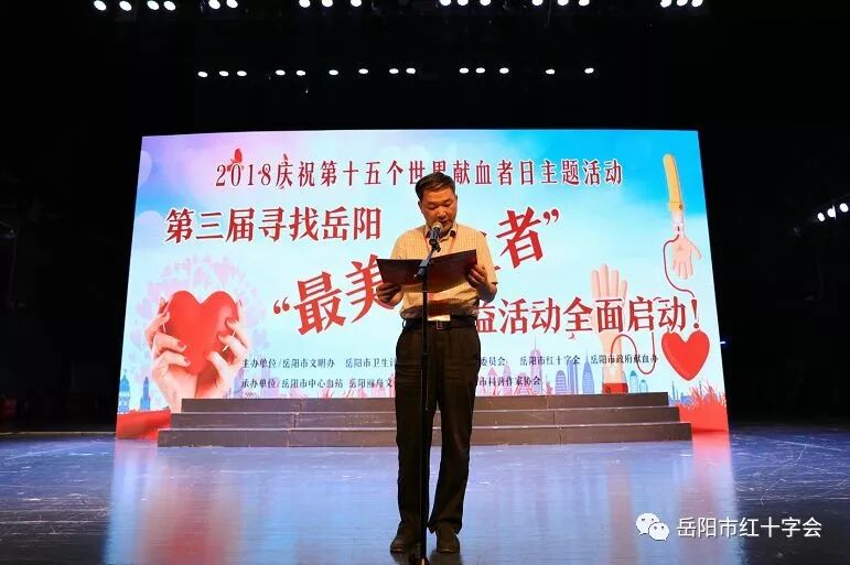 6月14日,是第15个“世界献血者日”,也是《中华人民共和国献血法》实施20周年。当天上午9点,岳阳市文化艺术会展中心小剧场内座无虚席,省红十字会顾问、省人大原副书记、副主任陈叔红,省委党校原副校长肖和平,省输血协会理事长易冬华,市人大常委会副主任陈志莲、市人民政府副市长、市红十字会会长李为,市政协副主席孔福建、市军分区副司令员易长运、市人民政府副秘书长陈文亮、省卫计委医政医管处副调研员尹澎、市委宣传部常务副部长许卫国、市卫生和计划生育委员会党组书记、主任彭纲要、团市委书记李乐等领导到场,与近500位来自我市社会各界支持无偿献血工作的爱心人士和志愿者团体组织欢聚一堂,共同庆祝“世界献血者日”的到来,并举行“第三届寻找岳阳“最美献血者”公益活动”颁奖仪式。