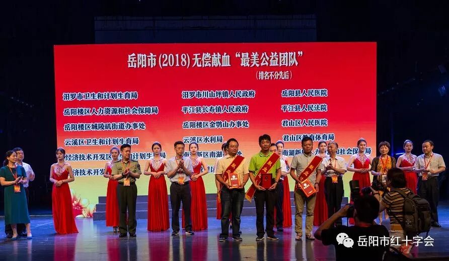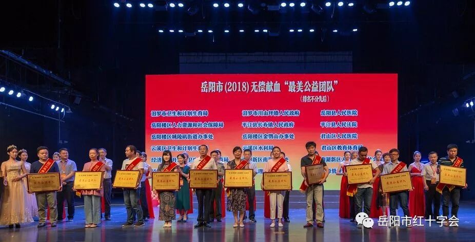 毛晖、周保国等20人获岳阳“最美献血者”称号,黎勇、刘彬等 20 人获岳阳“最美献髓者”称号,王永林、李冬桂等20 人获岳阳市无偿献血“最美志愿者”称号,郭飞香、杨立时等 20 人获岳阳市无偿献血“最美组织者”称号,中国石化巴陵分公司、湖南理工学院数学学院等40家单位被评为岳阳市无偿献血“最美公益团队”。献血超200次的周保国、丰小玉、陶程3位献血达人还受到了特别表彰。活动同时决定由市红十字会、市中心血站资助周娟等全市100名爱心困难学子及献血者困难家庭。